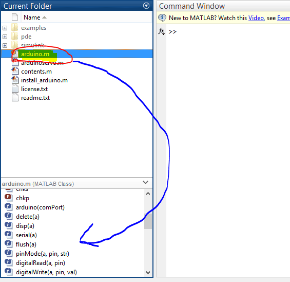 Now after your current folder is selected, you can click on arduino.m to get all the function and commands which you can use. You can see that, first command is arduino(comport).
